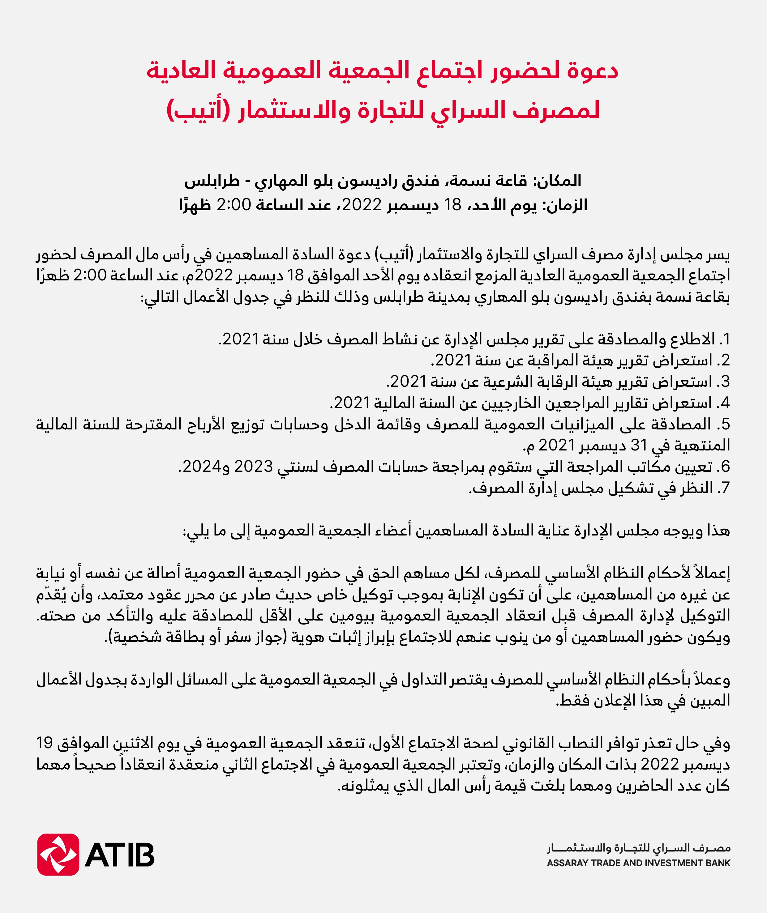 يسر مجلس إدارة مصرف السراي للتجارة والاستثمار (أتيب) دعوة السادة المساهمين في رأس مال المصرف لحضور اجتماع الجمعية العمومية العادية المزمع انعقاده يوم الأحد الموافق 18 ديسمبر 2022م، عند الساعة 2:00 ظهرًا بقاعة نسمة بفندق راديسون بلو المهاري بمدينة طرابلس وذلك للنظر في جدول الأعمال التالي: